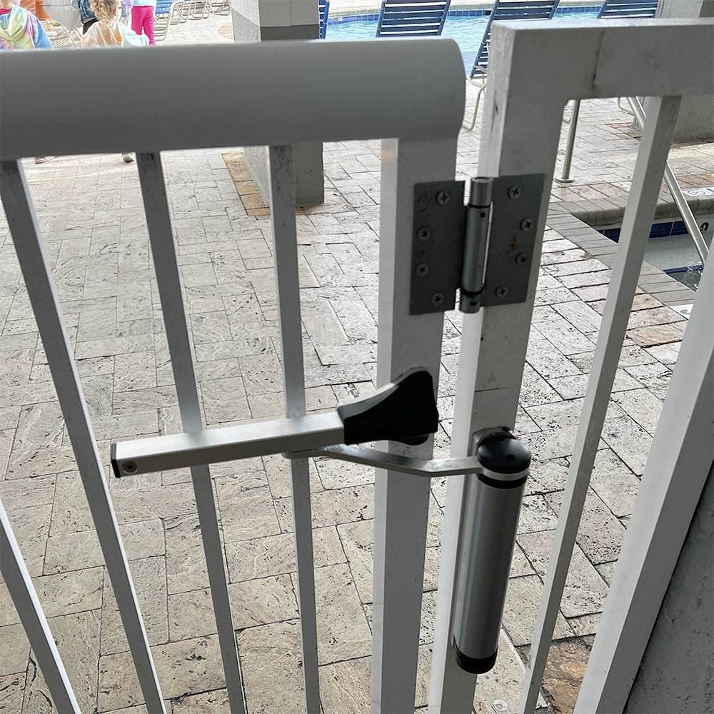 Aluminum fence works well for uneven terrain. Even though the pool will have a flat structure, there can still be uneven terrain around the pool or the yard area. The nice thing with aluminum fences compared to other fences such as wood or vinyl is that they have rackability. This means that the fence pickets can change angles to conform to the slope. The bottom rail of the fence will be parallel to the ground, preventing "stair-stepping." Stair-stepping can cause large gaps underneath the fence, which could prevent the pool fence from being up to code.